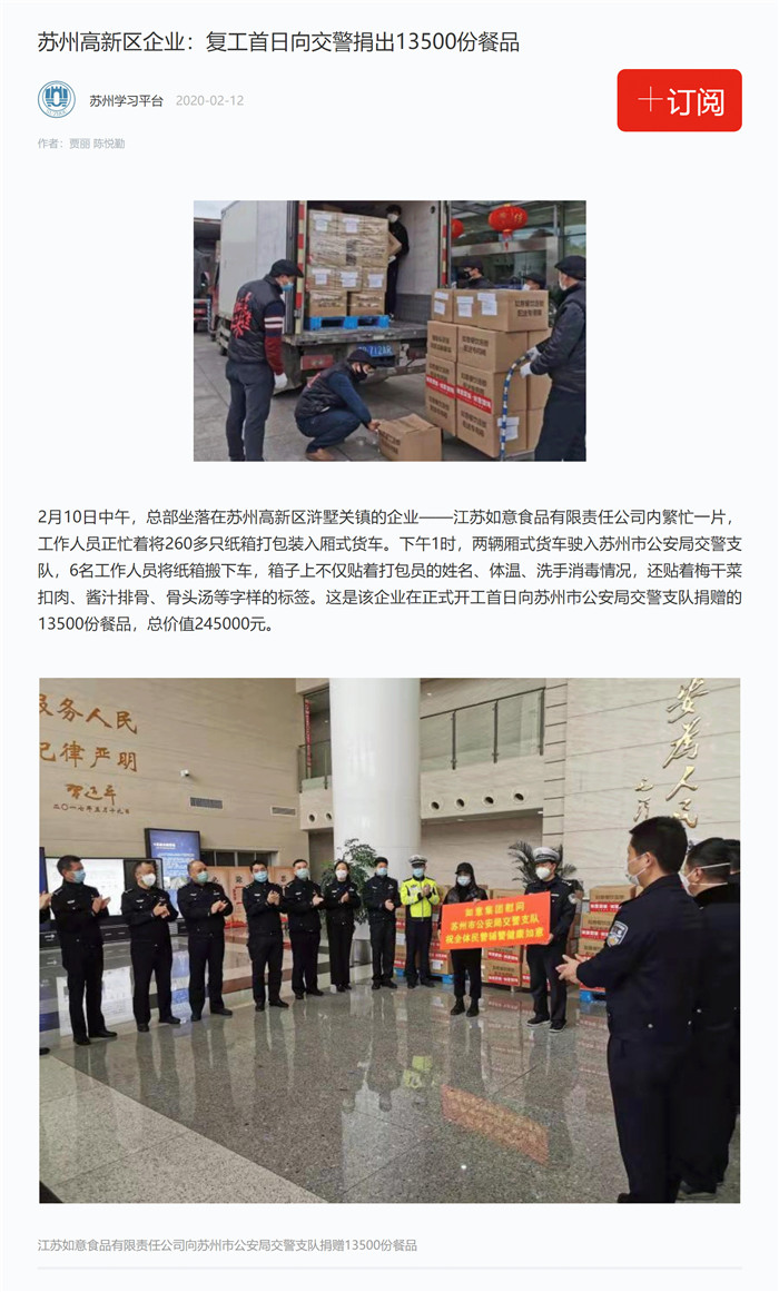 學習強國報道:蘇州高新區企業:復工首日向交警捐出13500份餐品