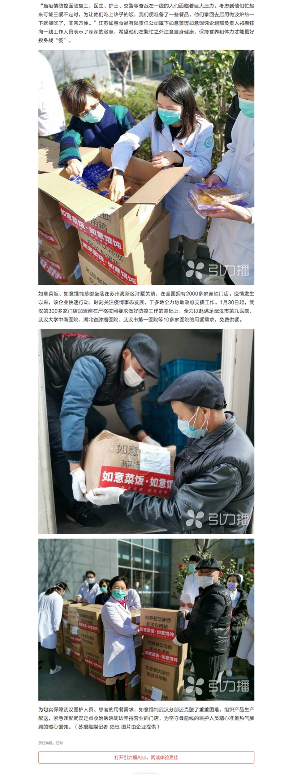 如意菜飯、如意餛飩總部坐落在蘇州高新區(qū)滸墅關(guān)鎮(zhèn),在全國擁有2000多家連鎖門店。疫情發(fā)生以來,該企業(yè)快速行動,時(shí)刻關(guān)注疫情事態(tài)發(fā)展,于多地全力協(xié)助政府支援工作。1月30日起,武漢的300多家門店加盟商在嚴(yán)格按照要求做好防控工作的基礎(chǔ)上,全力以赴滿足武漢市第九醫(yī)院、武漢大學(xué)中南醫(yī)院、湖北省腫瘤醫(yī)院、武漢市第一醫(yī)院等10多家醫(yī)院的用餐需求,免費(fèi)供餐。
