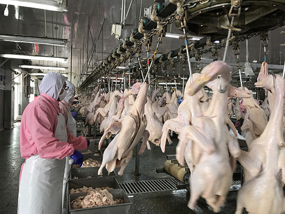 經(jīng)過檢驗(yàn)后的毛雞、毛鴨會被倒掛在機(jī)械化生產(chǎn)線的鐵夾上,緊接著,先后進(jìn)入電麻、刺殺、瀝血、浸燙、脫毛、預(yù)冷、宰前檢驗(yàn)、凈膛、清洗、宰后檢驗(yàn)等加工環(huán)節(jié)(此處省略一萬字)。