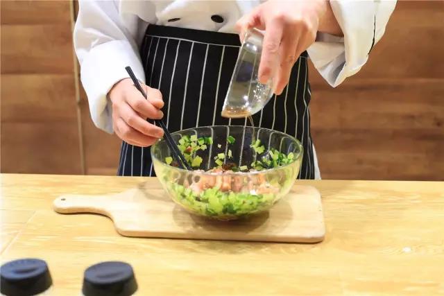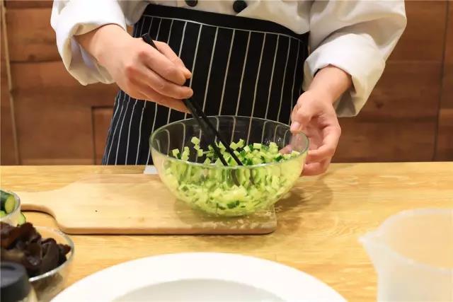 由于黃瓜中的水分較多,在拌餡兒之前,撒入一點鹽,方便將黃瓜汁擠出來。