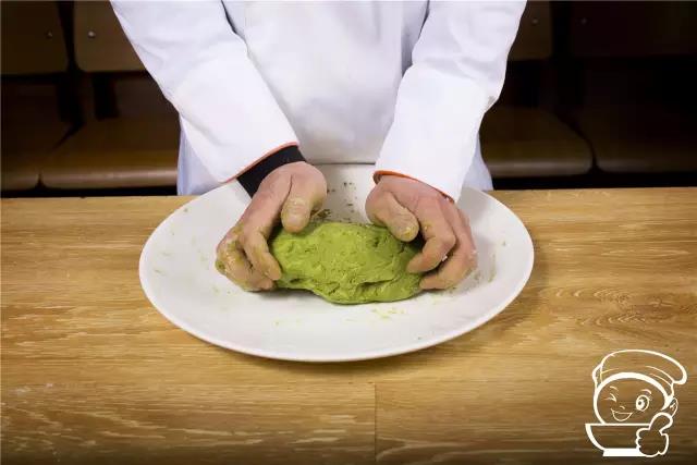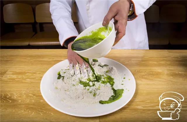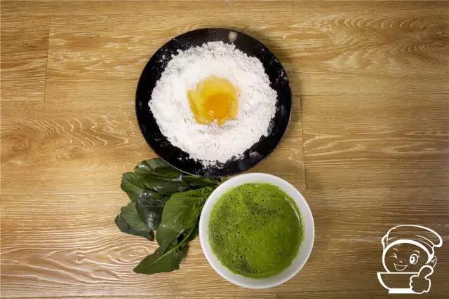 將雞蛋打入面粉中,開始和面,和面的過程中逐步倒入榨好的菠菜汁。