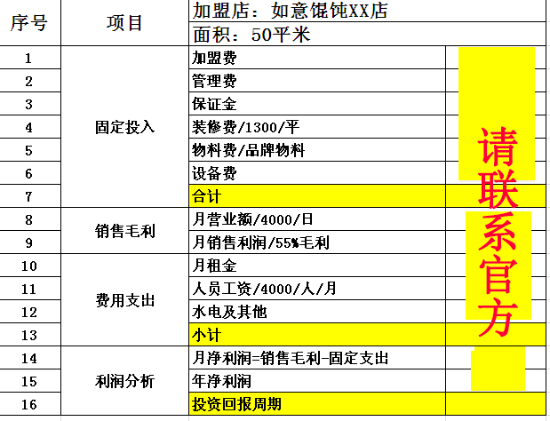 注意:上圖為什么都會被清除呢,主要還是每個城市,每個縣城,你開店的費用其實是不好給一個確定的數(shù)字,如果說您看到網(wǎng)絡(luò)上告訴你開如意餛飩加盟費用需要多少錢,那都是假冒的官方信息,如意餛飩加盟費用明細想要了解的話,可以在線進行留言,我司將安排專業(yè)的業(yè)務(wù)人員跟您對接,然后給您詳細的解答,把上邊的費用詳細給您說一下!